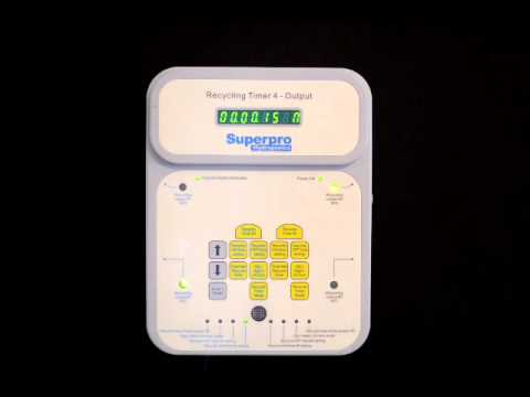 The Superpro MFRT-1 features two individual recycling timers, each with an On and Off setting, totaling four timer functions. The device includes four output plugs, each linked to one of the four timer settings. The recycling timers, Timer #1 and Timer #2, can be set to function during the day, night, or continuously over 24 hours. In operation, one of the two outputs will be energized as the timer counts down, providing a 'flip-flop' feature where one output is on while the other is off, ensuring that both N/O (normally open) and N/C (normally closed) outputs are never on simultaneously.