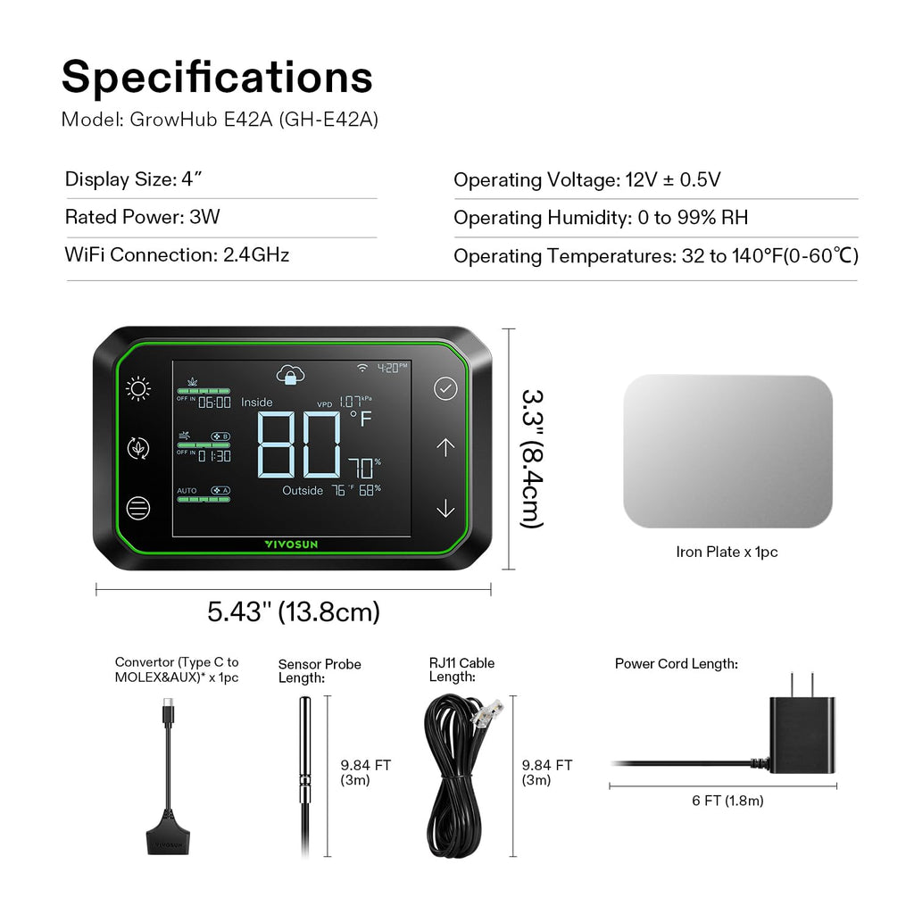 Whether you’re growing indoors for hobby or commercial production, the VIVOSUN E42A Controller ensures your plants are always in the perfect environment for maximum growth, yield, and quality, with the convenience of smartphone control at your fingertips.